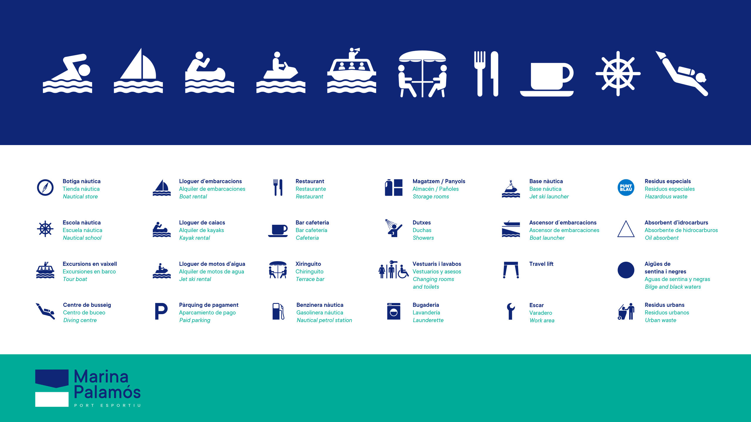 Dado que Marina Palamós recibe un elevado flujo de visitantes nacionales e internacionales, se desarrolló un sistema de señalética trilingüe (catalán, castellano e inglés) que garantiza comprensión rápida y una lectura cómoda. El sistema se basa en: Una iconografía propia diseñada a medida para representar todas las actividades, servicios y puntos de interés del puerto.