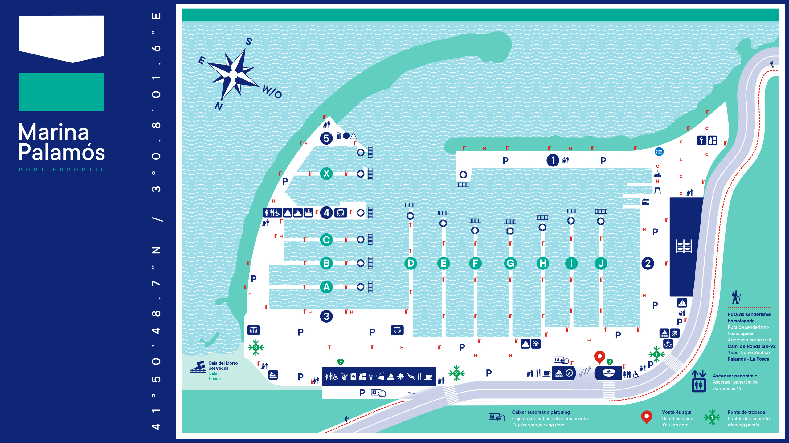 En NTITY desarrollamos la nueva identidad visual y el sistema completo de señalización y comunicación de Marina Palamós, uno de los puertos deportivos más relevantes de la Costa Brava. El reto consistía en actualizar la imagen del puerto para reflejar su vocación de servicio, su apertura al visitante y su estrecha relación con el entorno marítimo y la cultura mediterránea.