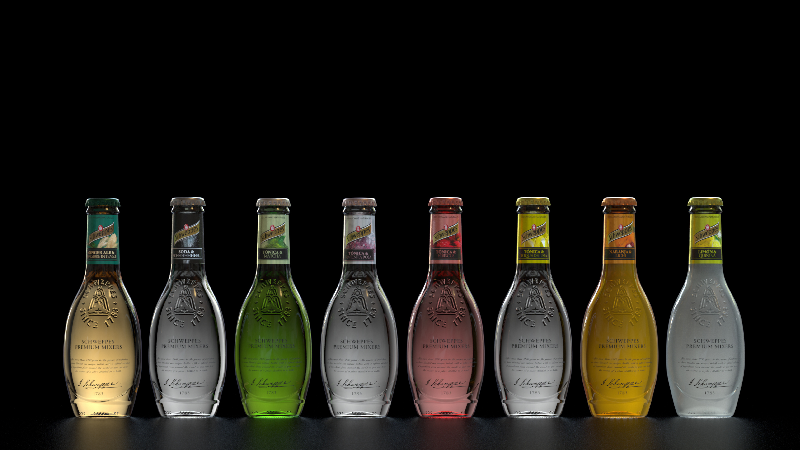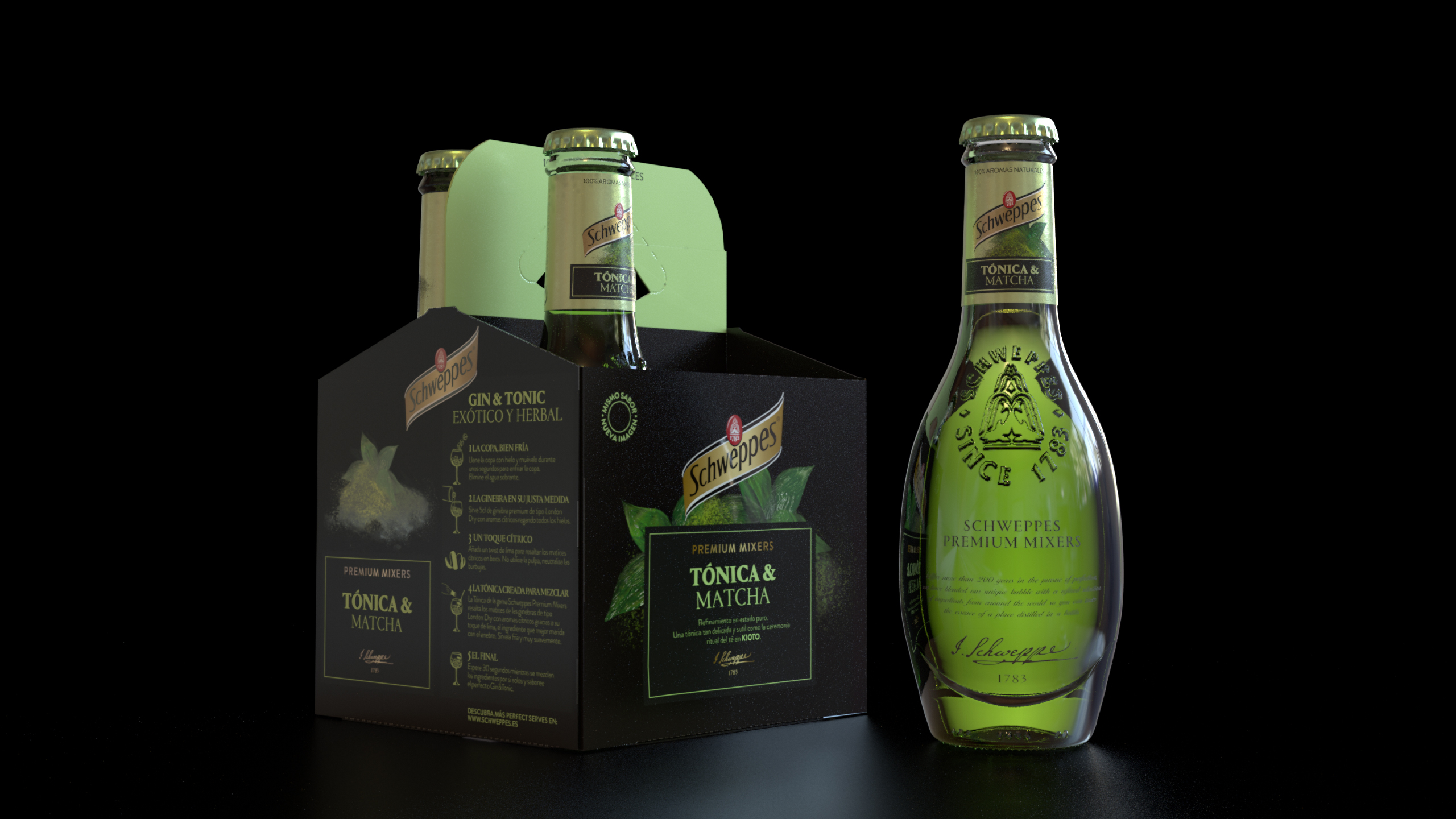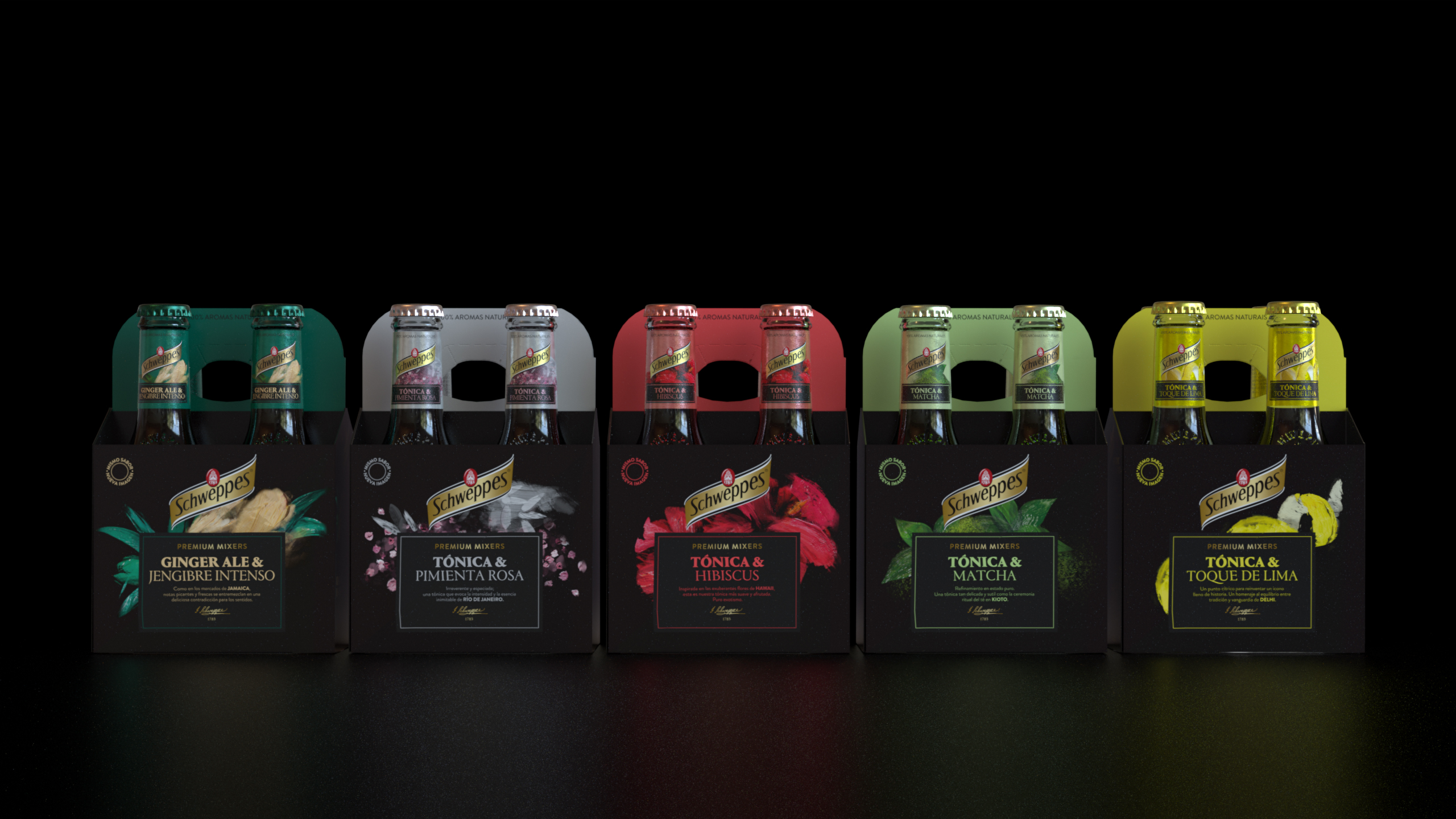 Las botellas icónicas de Schweppes, con su relieve histórico y su silueta reconocible, se integran en un sistema gráfico que equilibra sobriedad y expresividad. Los packs en negro profundo actúan como un “escenario