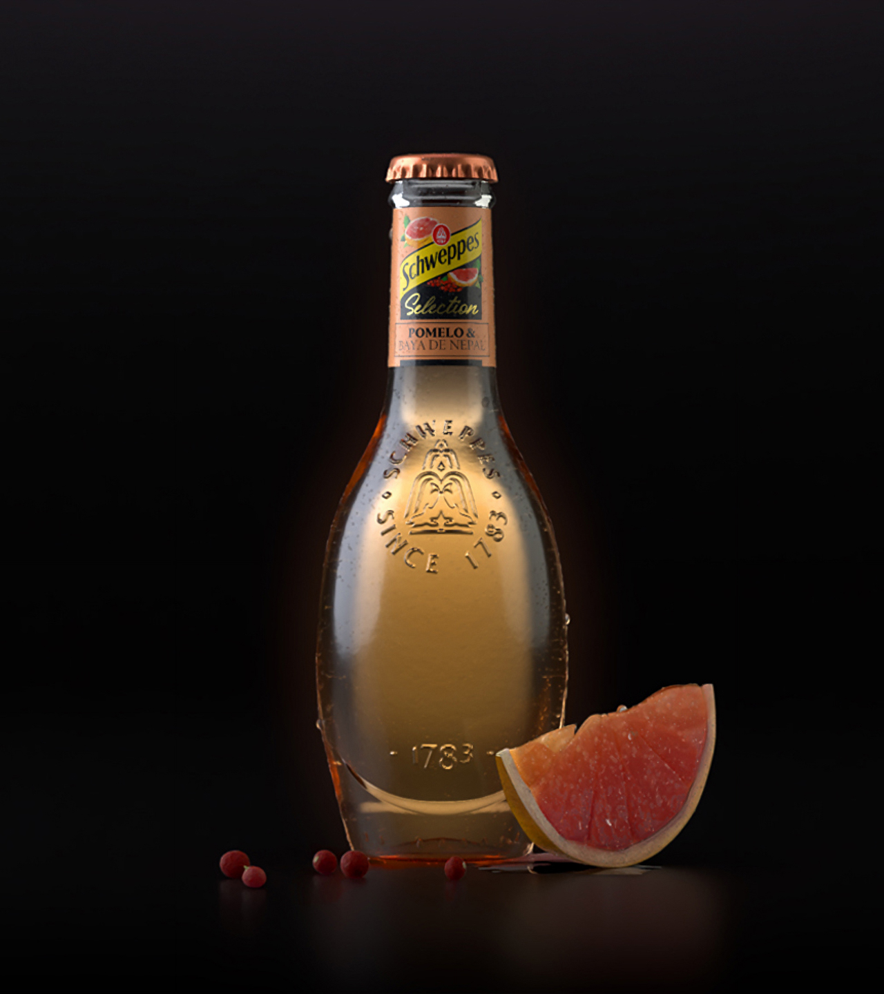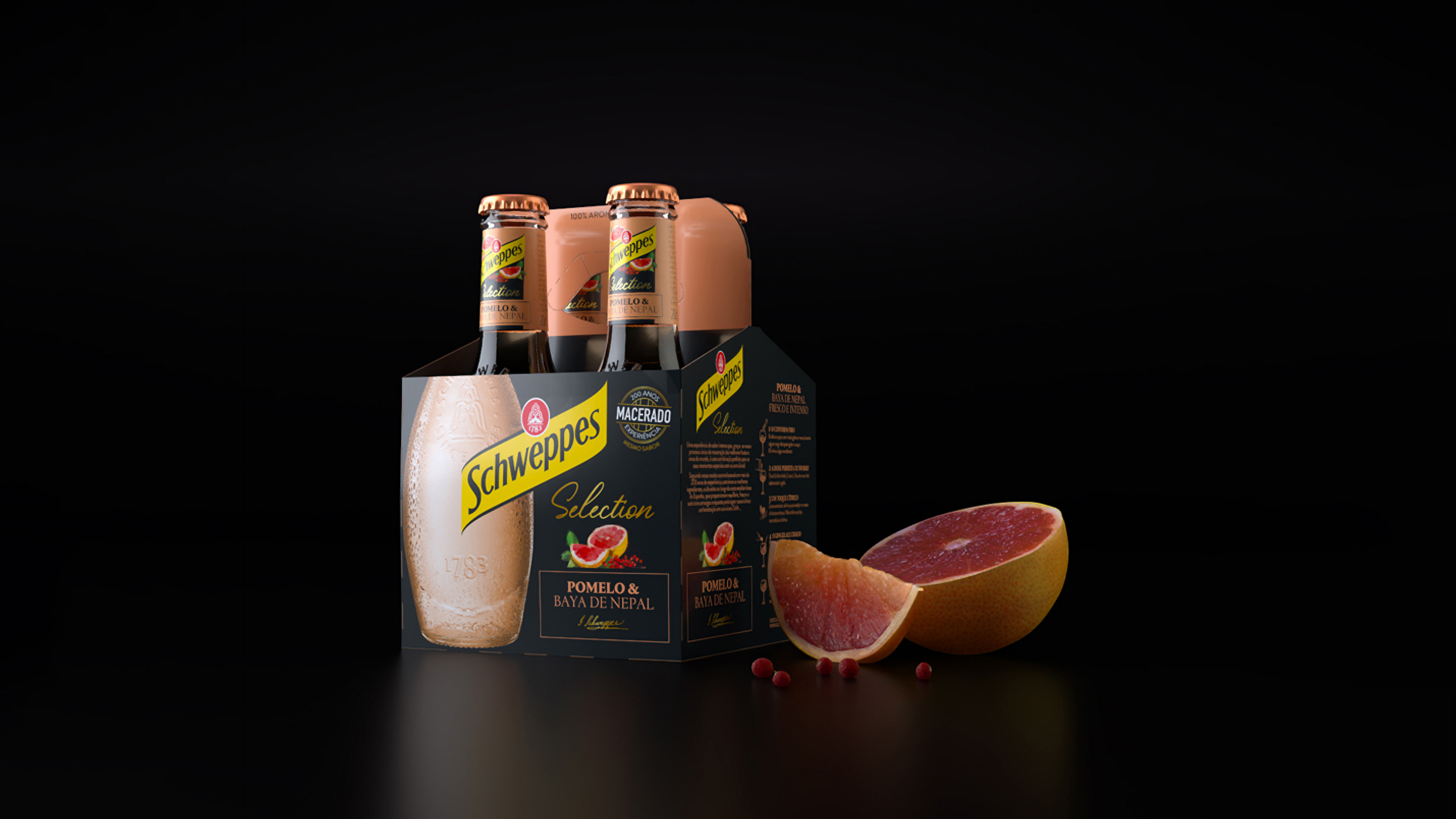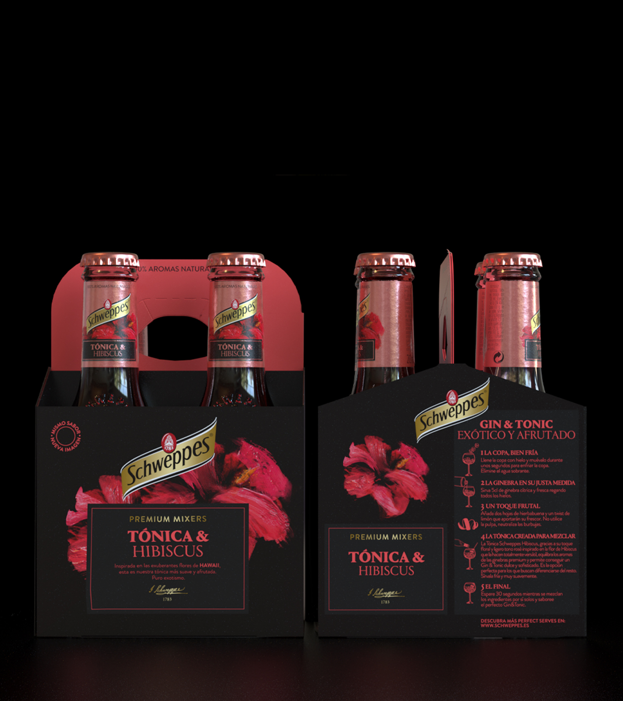 Las botellas icónicas de Schweppes, con su relieve histórico y su silueta reconocible, se integran en un sistema gráfico que equilibra sobriedad y expresividad. Los packs en negro profundo actúan como un “escenario